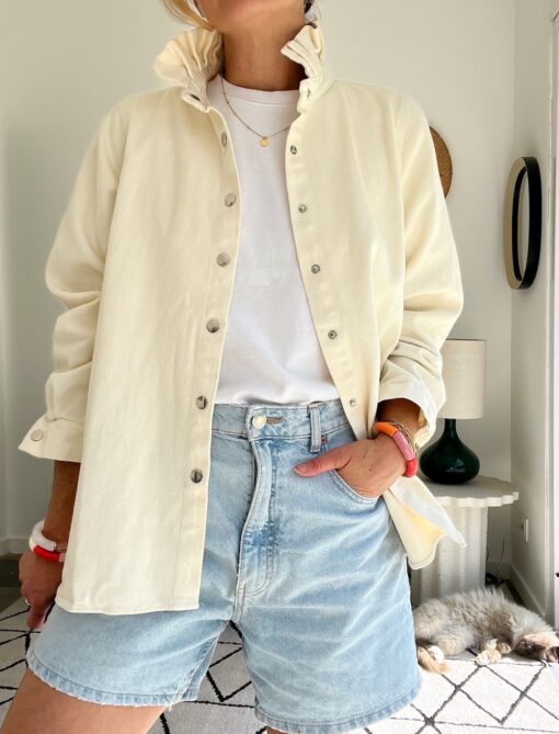 - On adore: sa teinte écrue lumineuse, elle s’associe facilement avec des tons neutres, pastels ou denim brut, elle peut être portée comme une veste légère ou comme une chemise